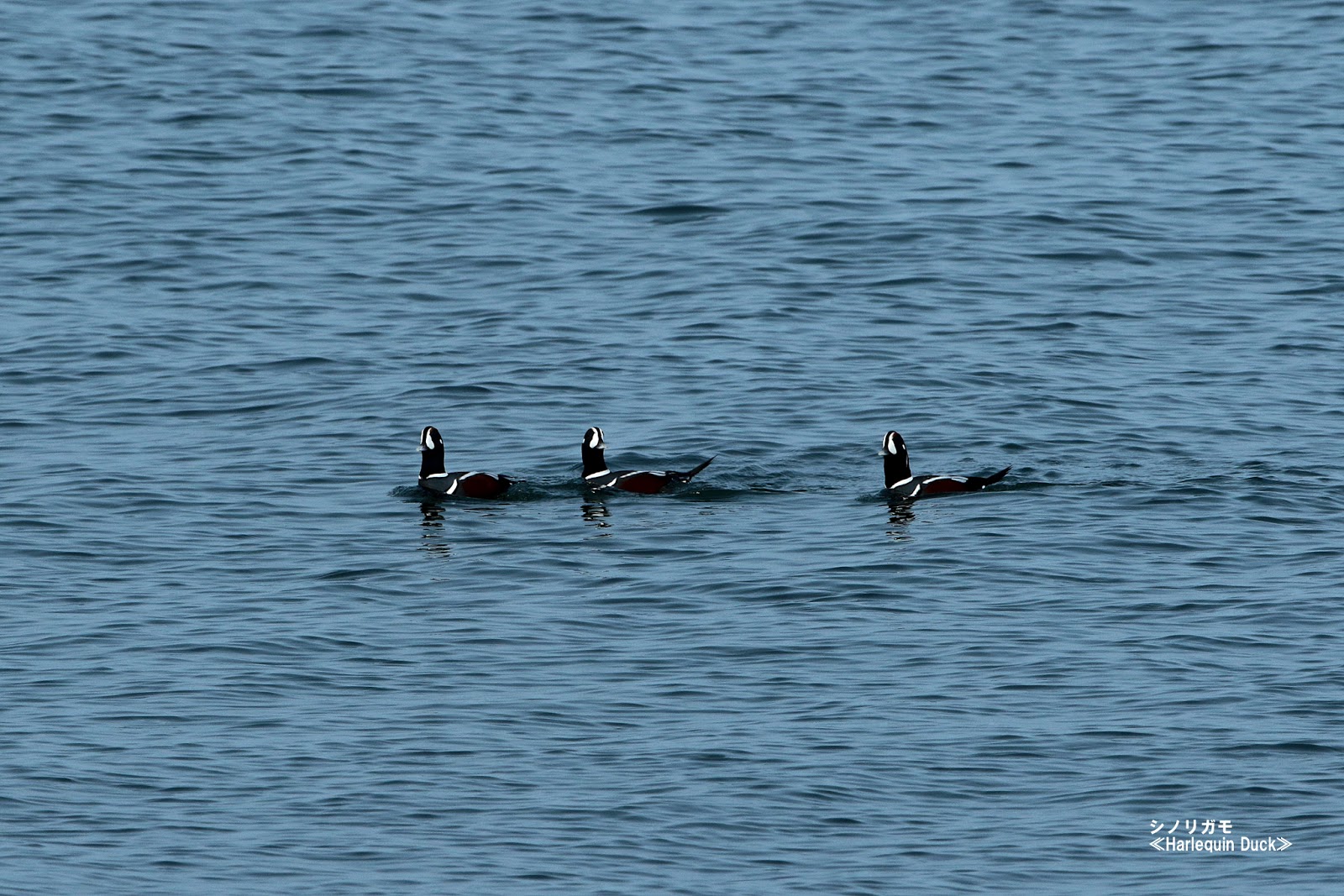 | シロエリオオハム≪Pacific Diver/Loom≫ クロガモ ≪Black Scoter≫ ウトウ ≪Rhinoceros Auklet≫ の編隊飛行 |